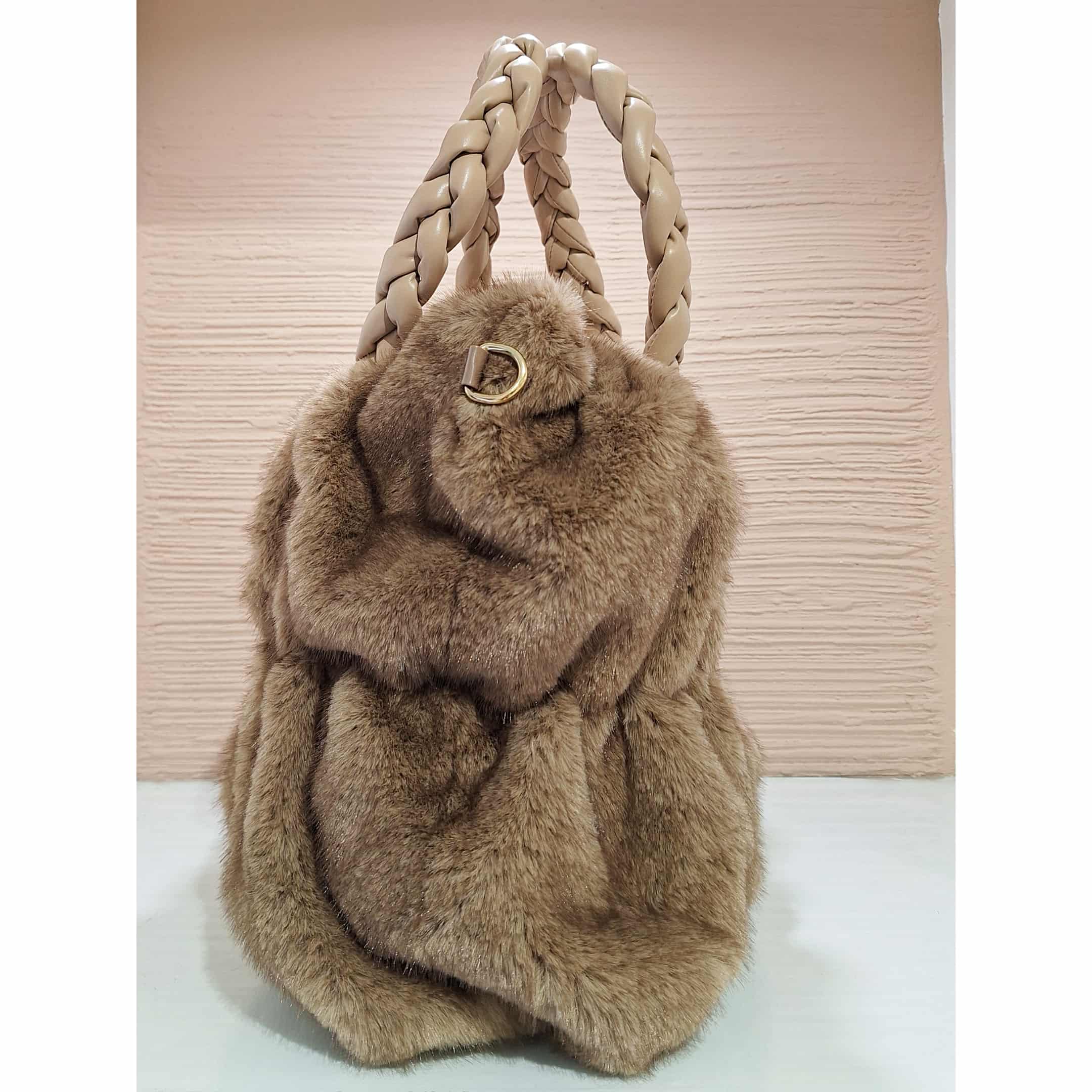 Borsa in ecopelliccia color fango con manico intrecciato in ecopelle e tracolla catena oro