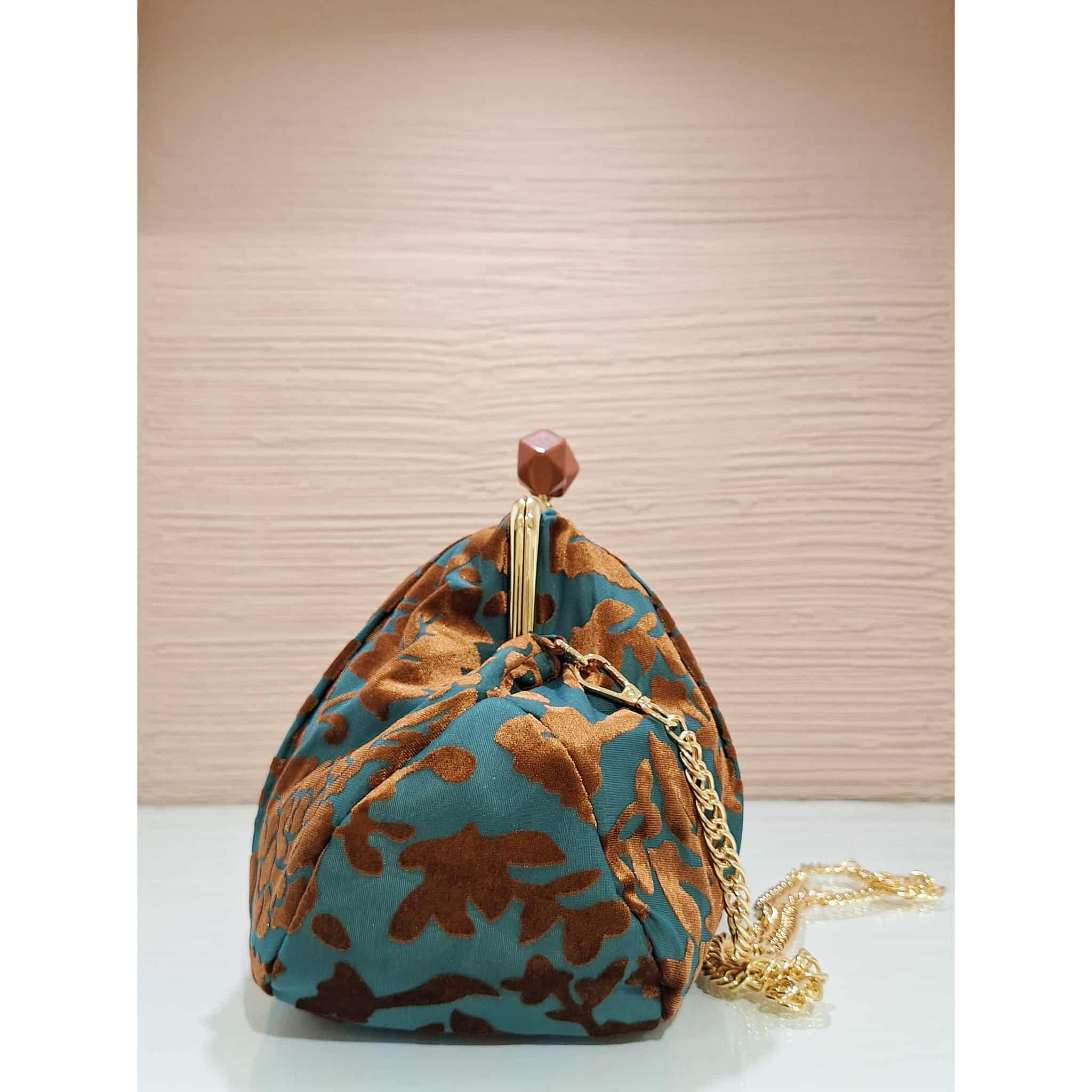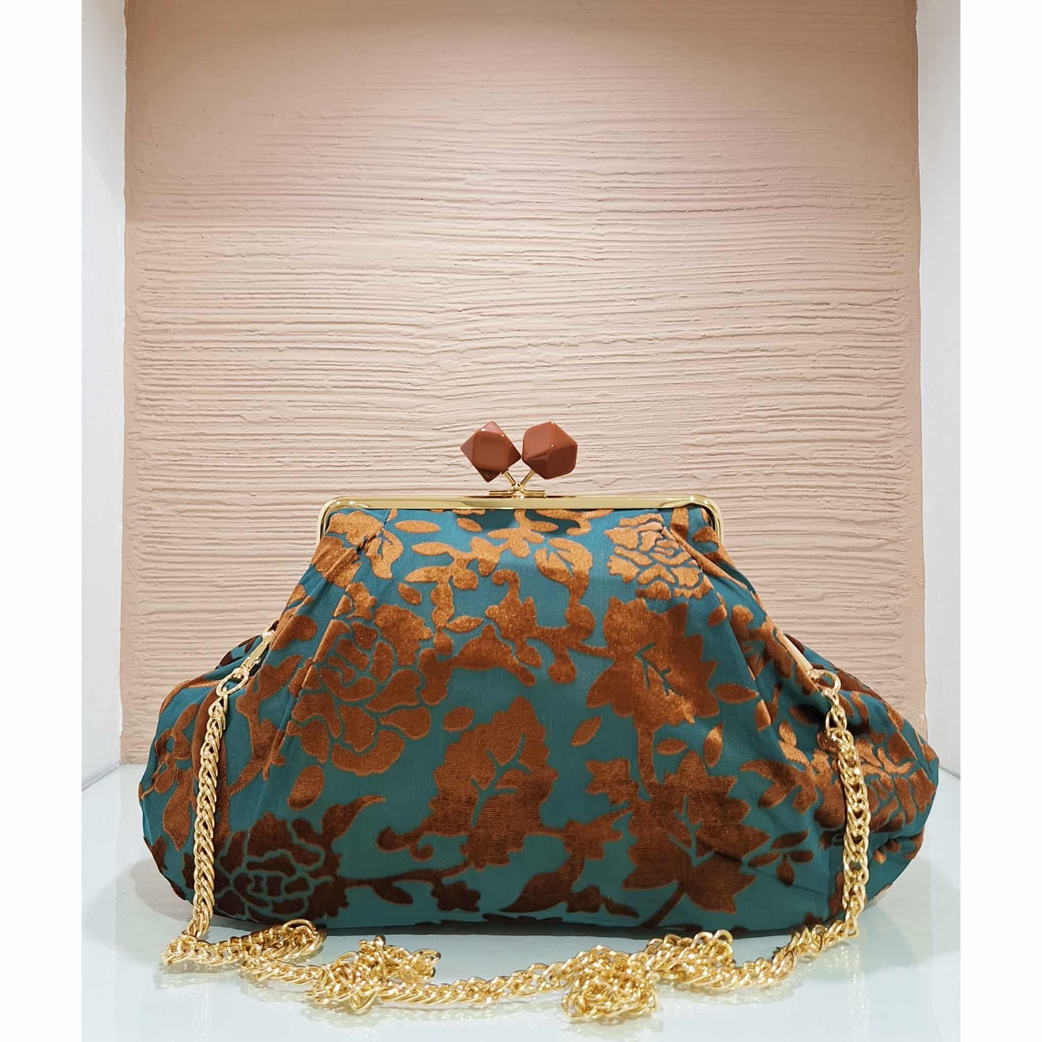Borsa a borsello tessuto jacquard verde e marrone in tessuto con inserti in velluto, chiusura a scatto con tracolla catena oro