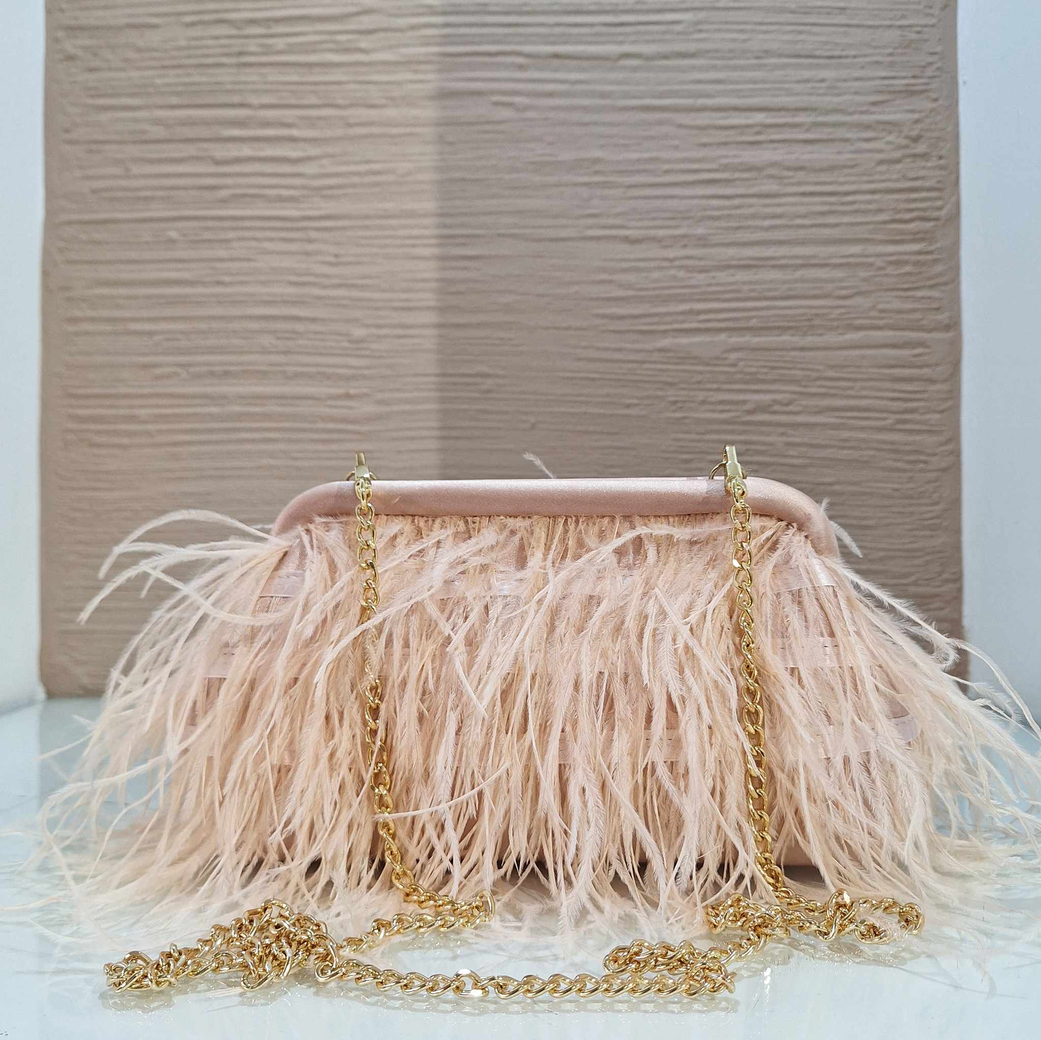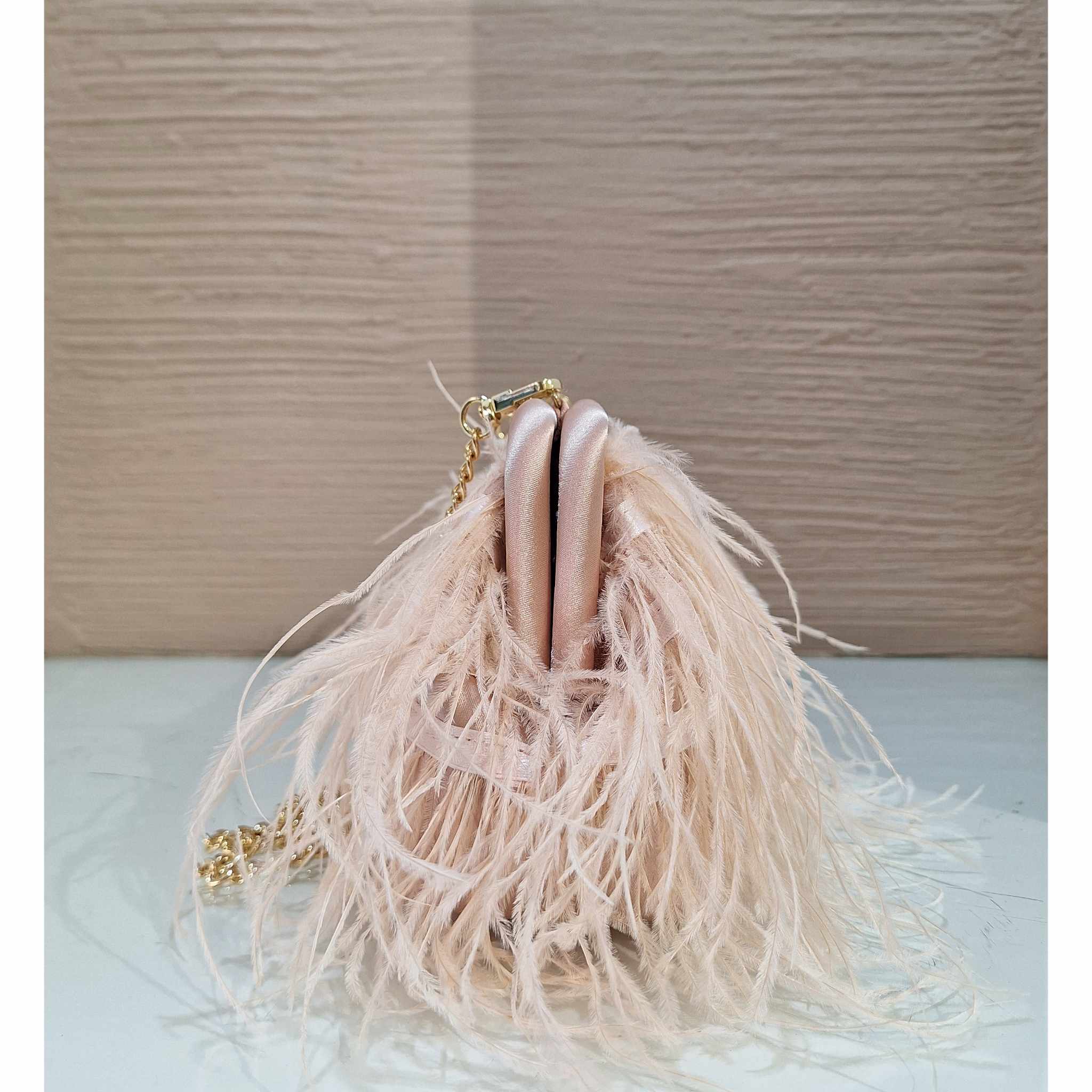 Borsa tracolla cipria con piume cipria dettaglio chiusura magnetica in raso cipria e tracolla catena oro