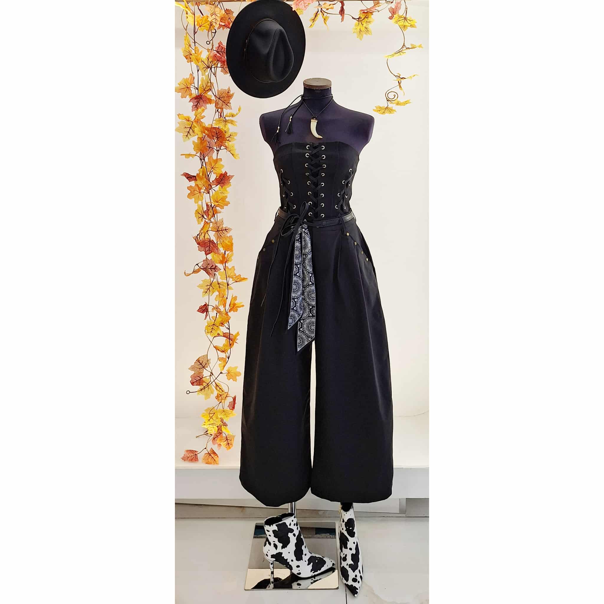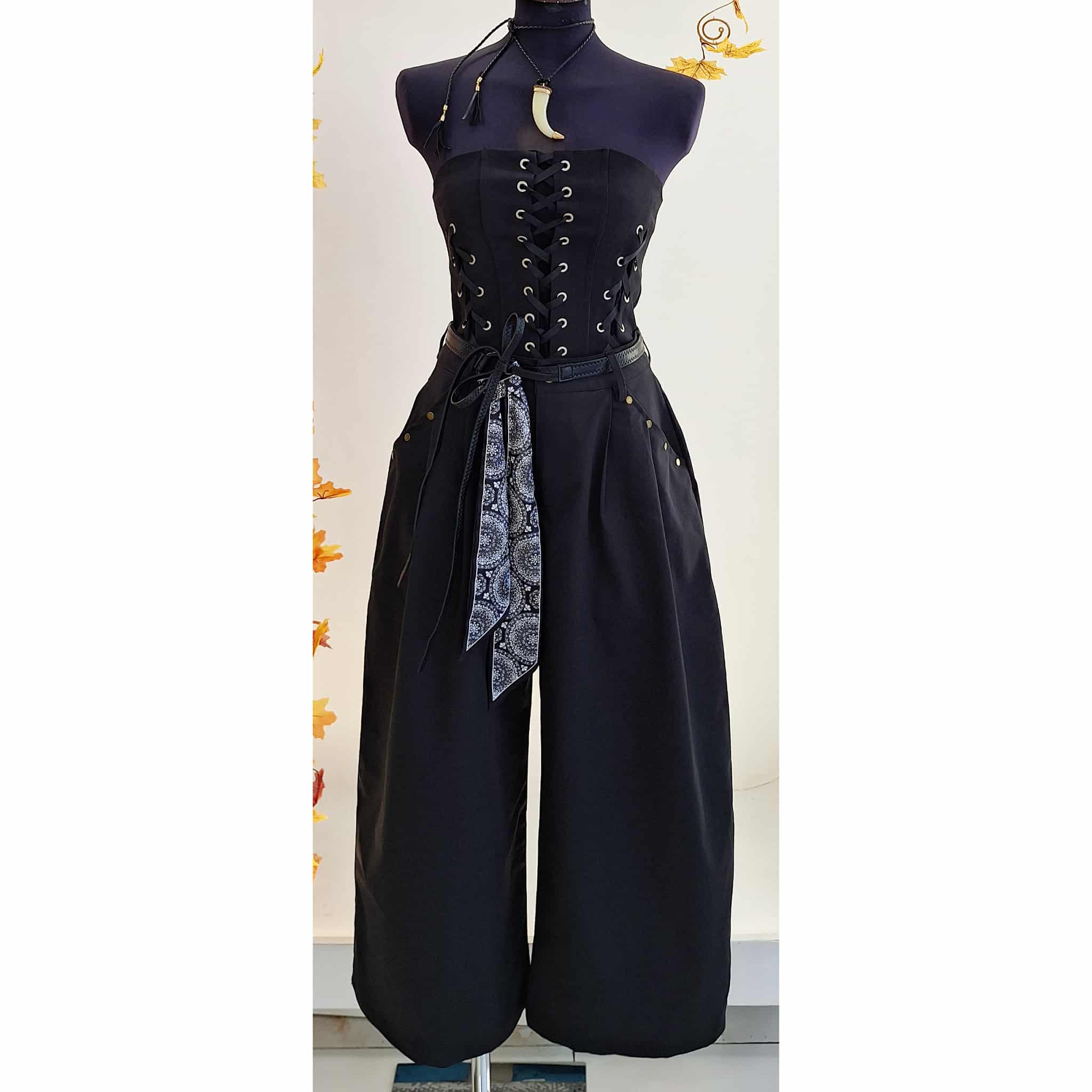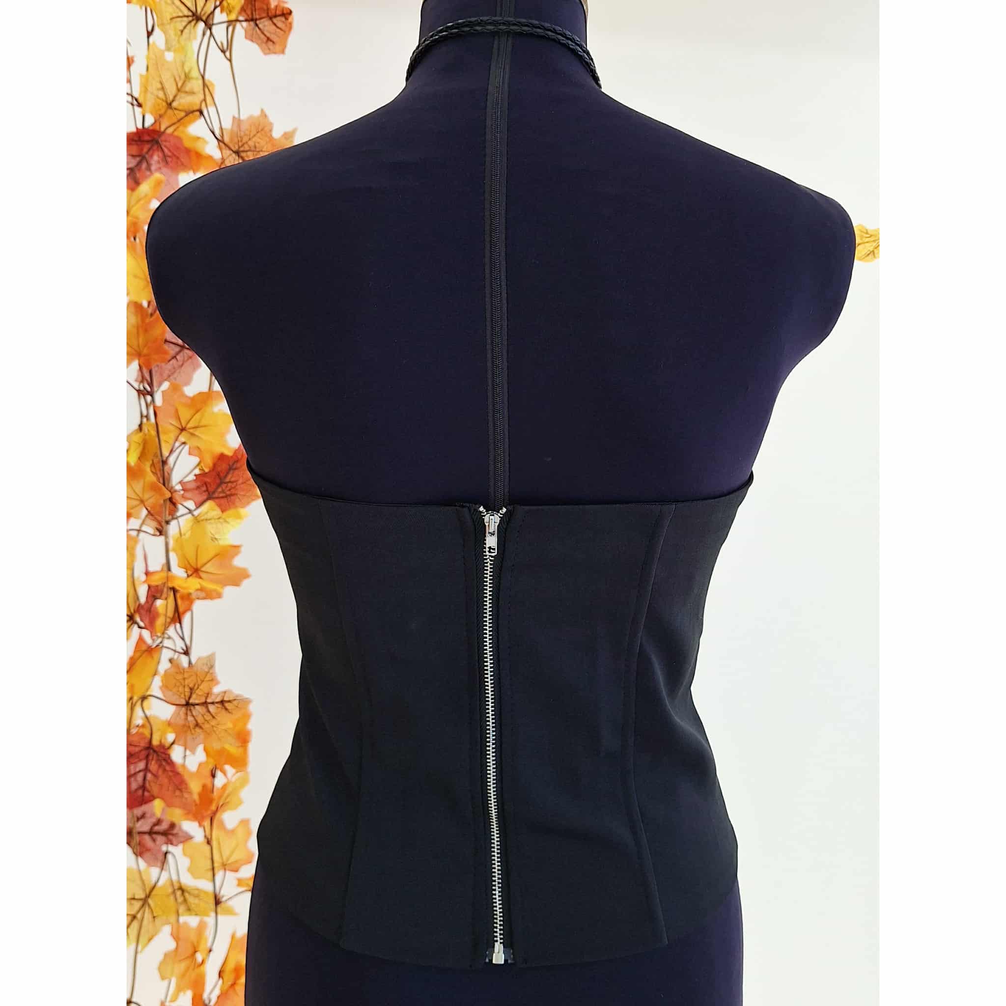 Bustino nero con dettaglio stringhe e pizzo, senza bretelle con chiusura zip sul retro