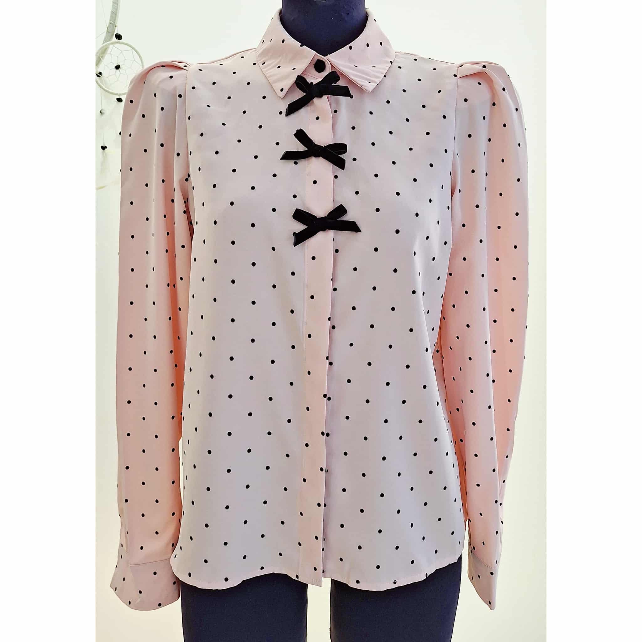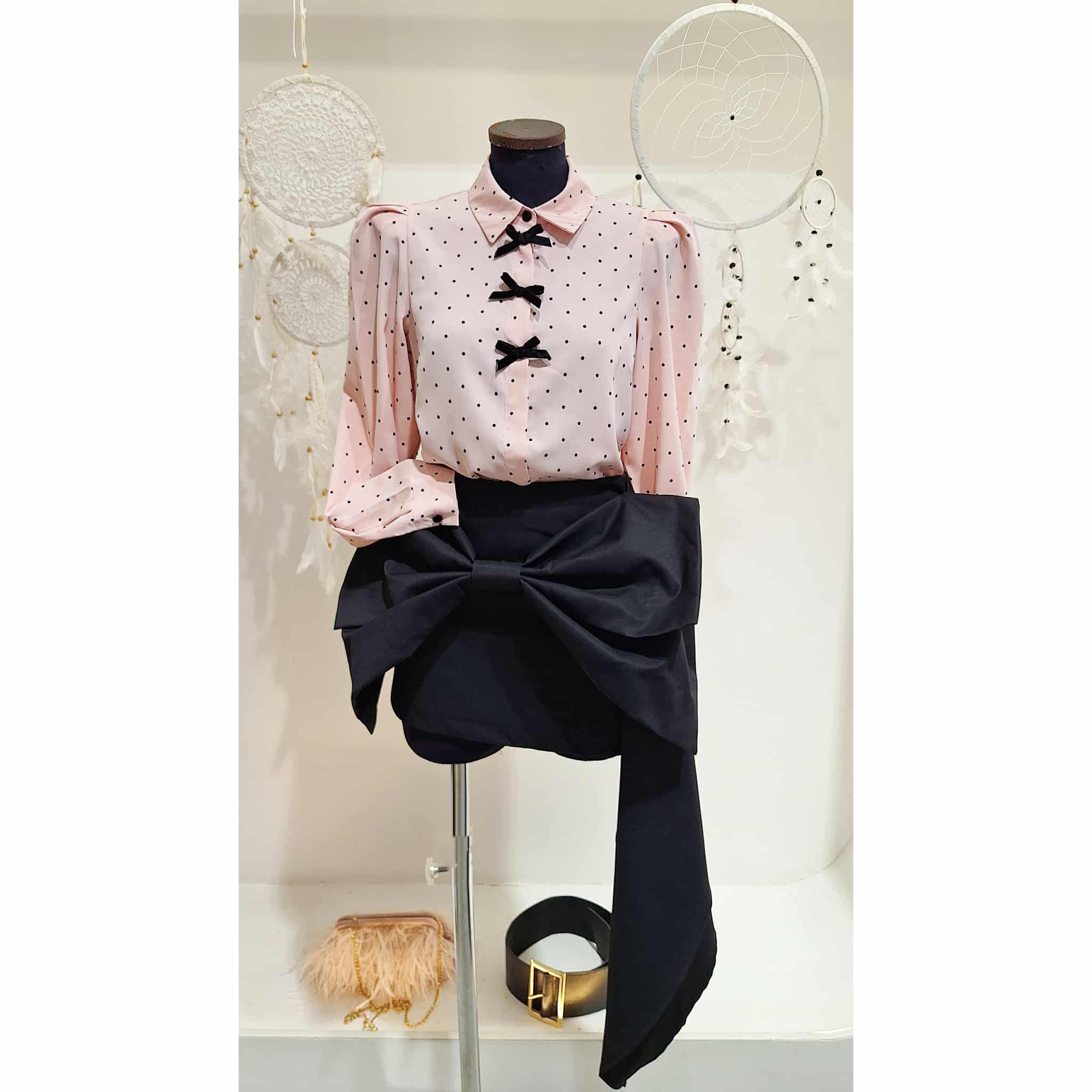 Camicia rosa con pois neri, dettaglio fiocchetti neri in velluto e bottoncini al collo e ai polsini neri in velluto