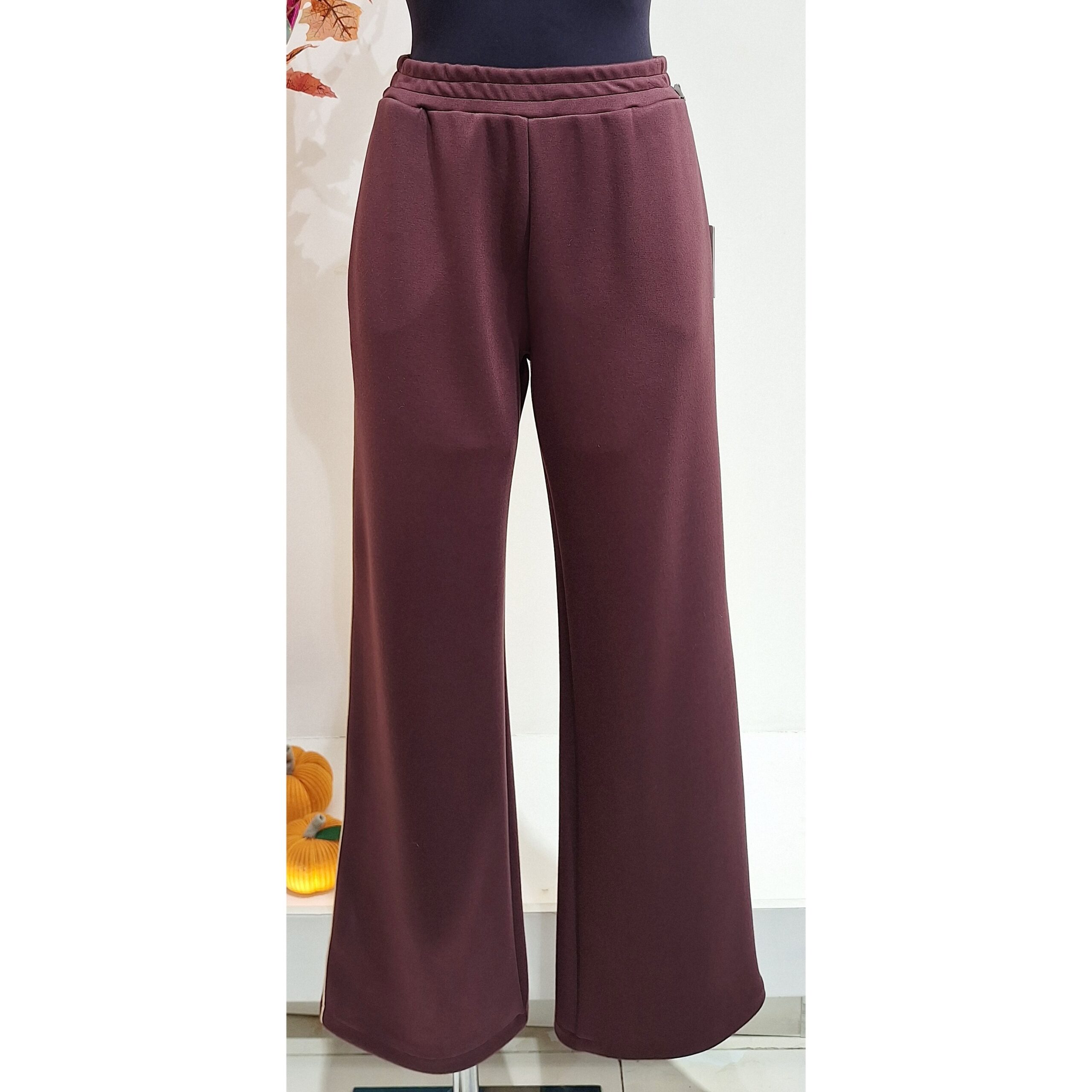 Coordinato tuta vinaccio composto da felpa e pantalone leggermente a zampa con dettaglio righino oro lungo la gamba del pantalone e il giromanica della felpa