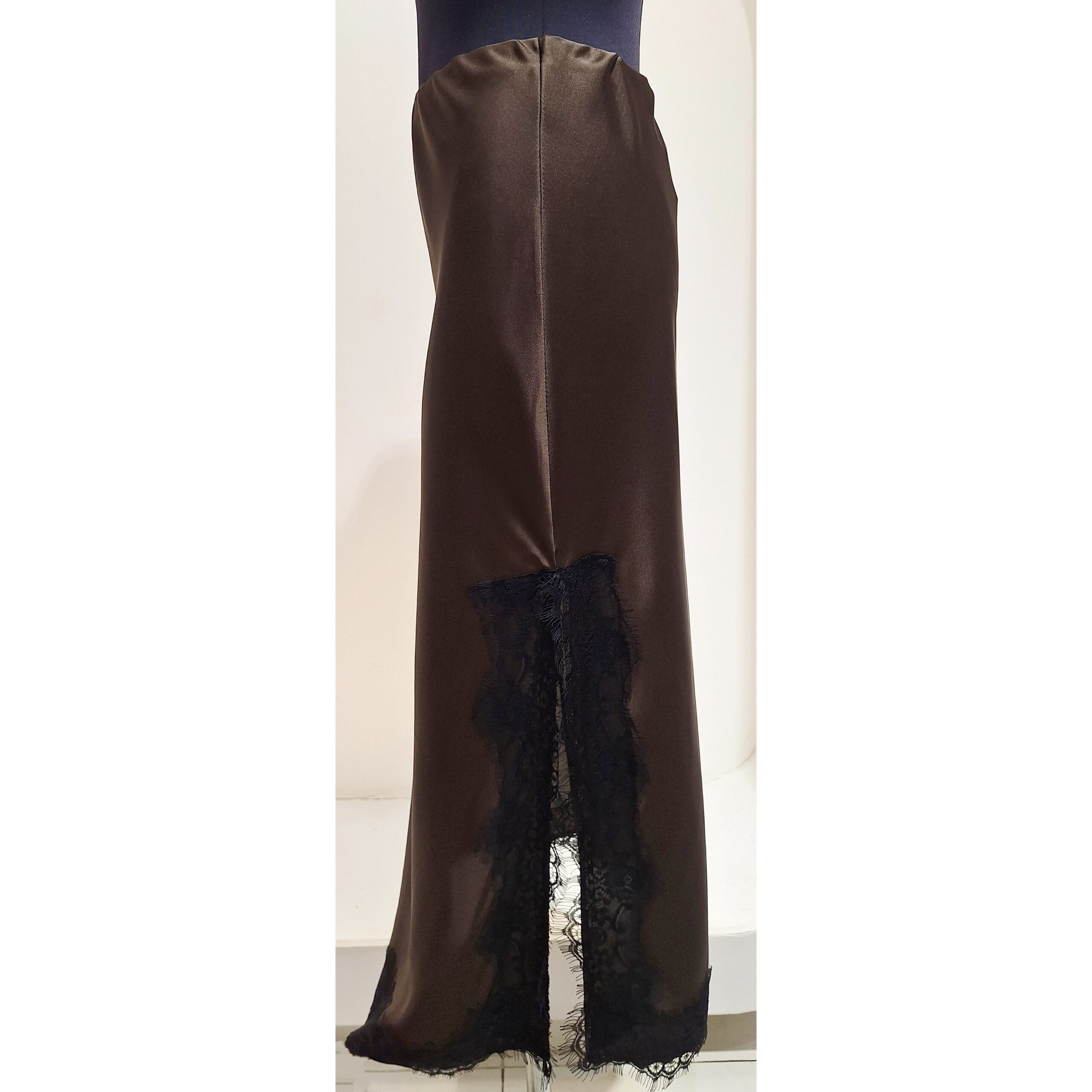 Gonna lunga in raso marrone con pizzo applicato a contrasto nero, con ampio spacco laterale ed elasticizzata in vita