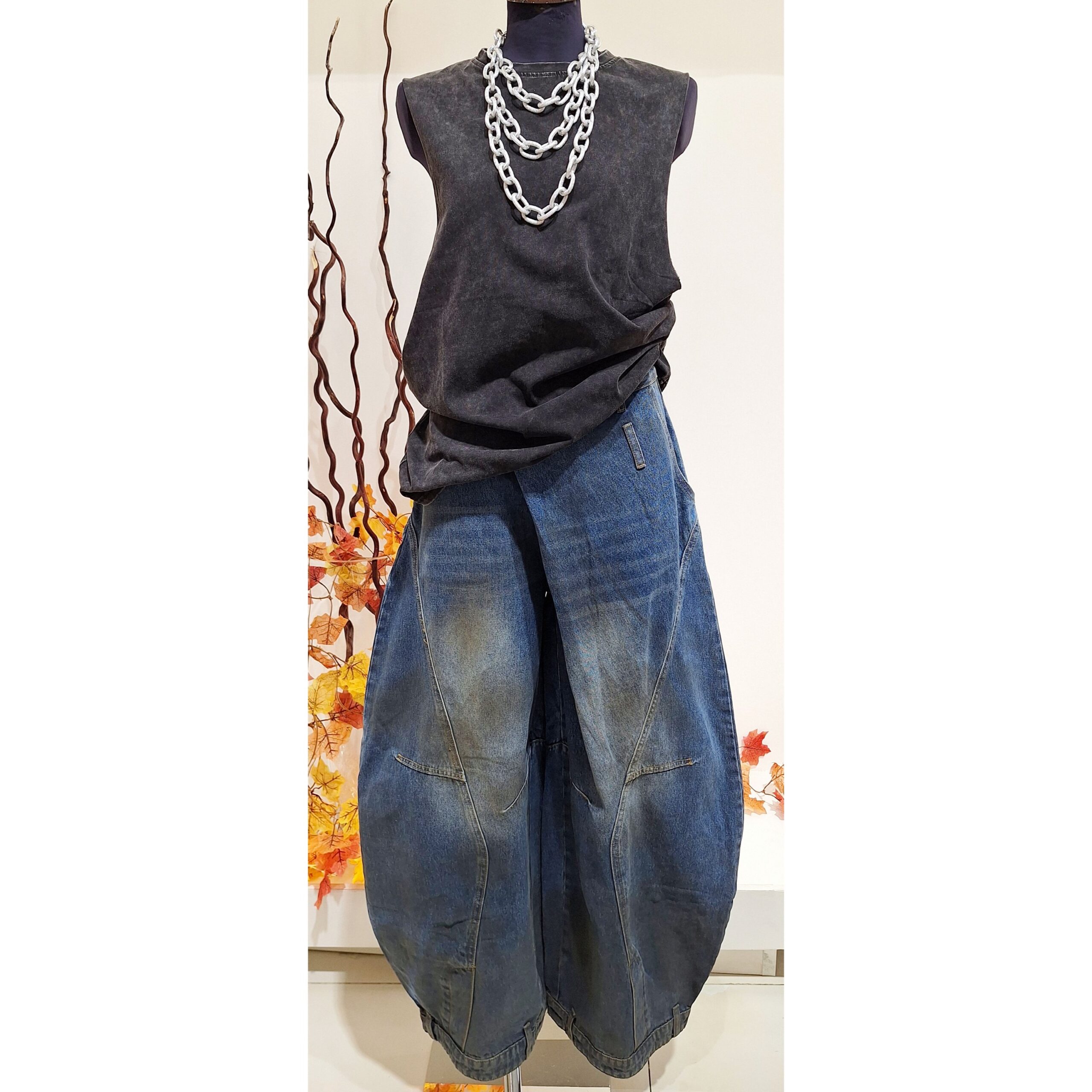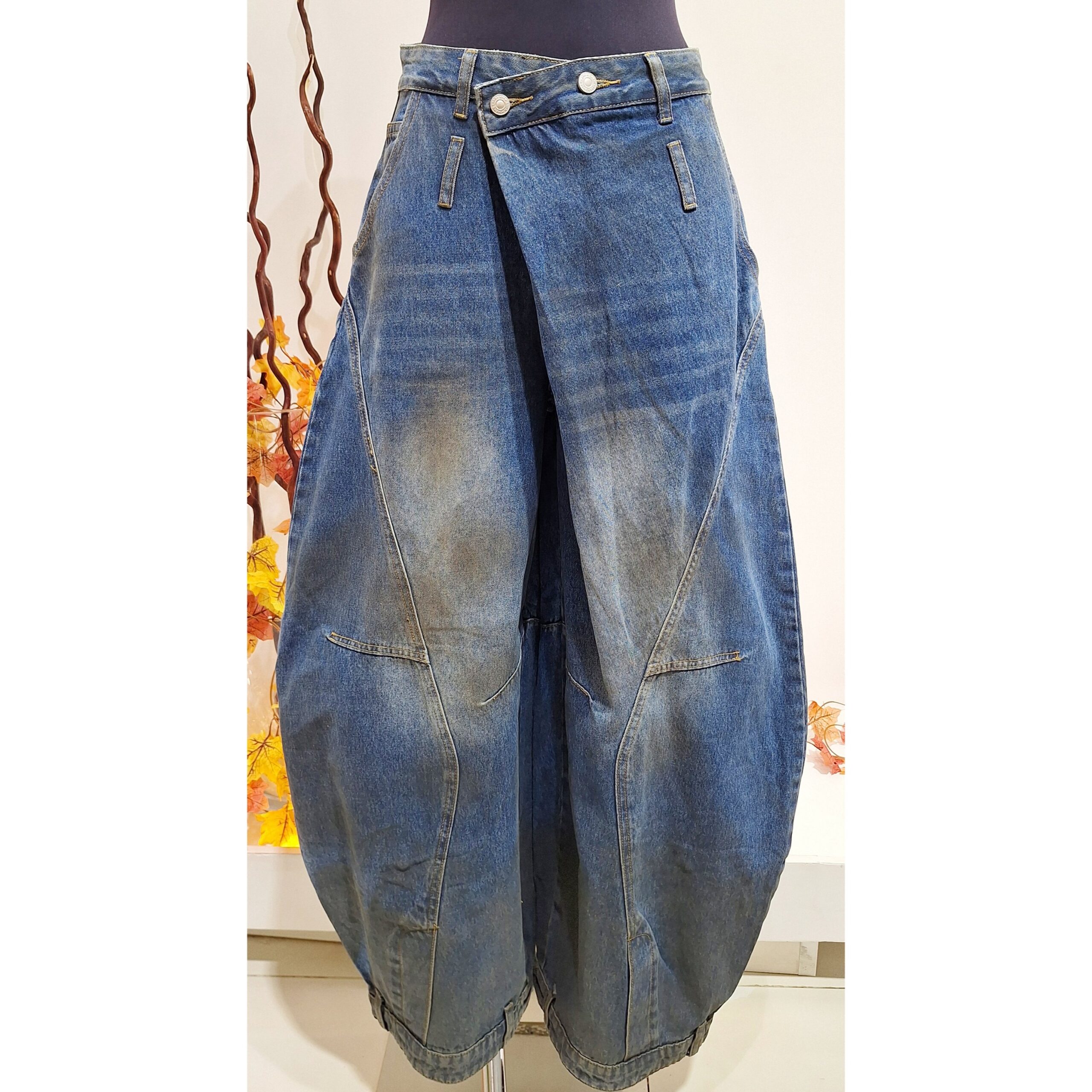 Jeans vita alta gamba larga over con abbottonatura asimmetrica e bordi rovesciati