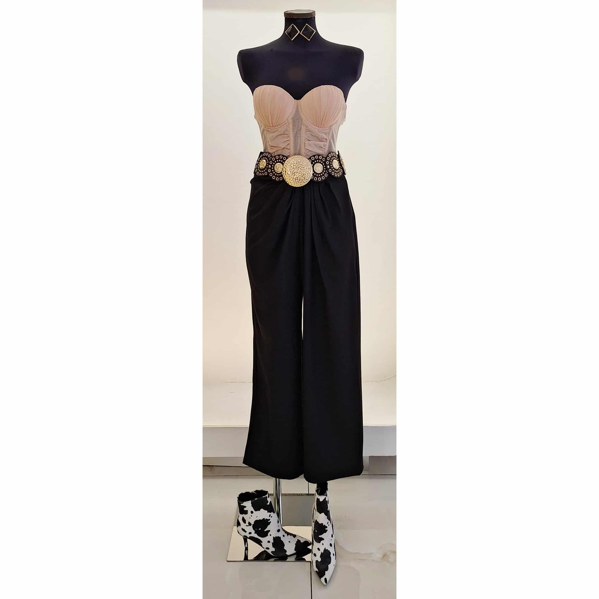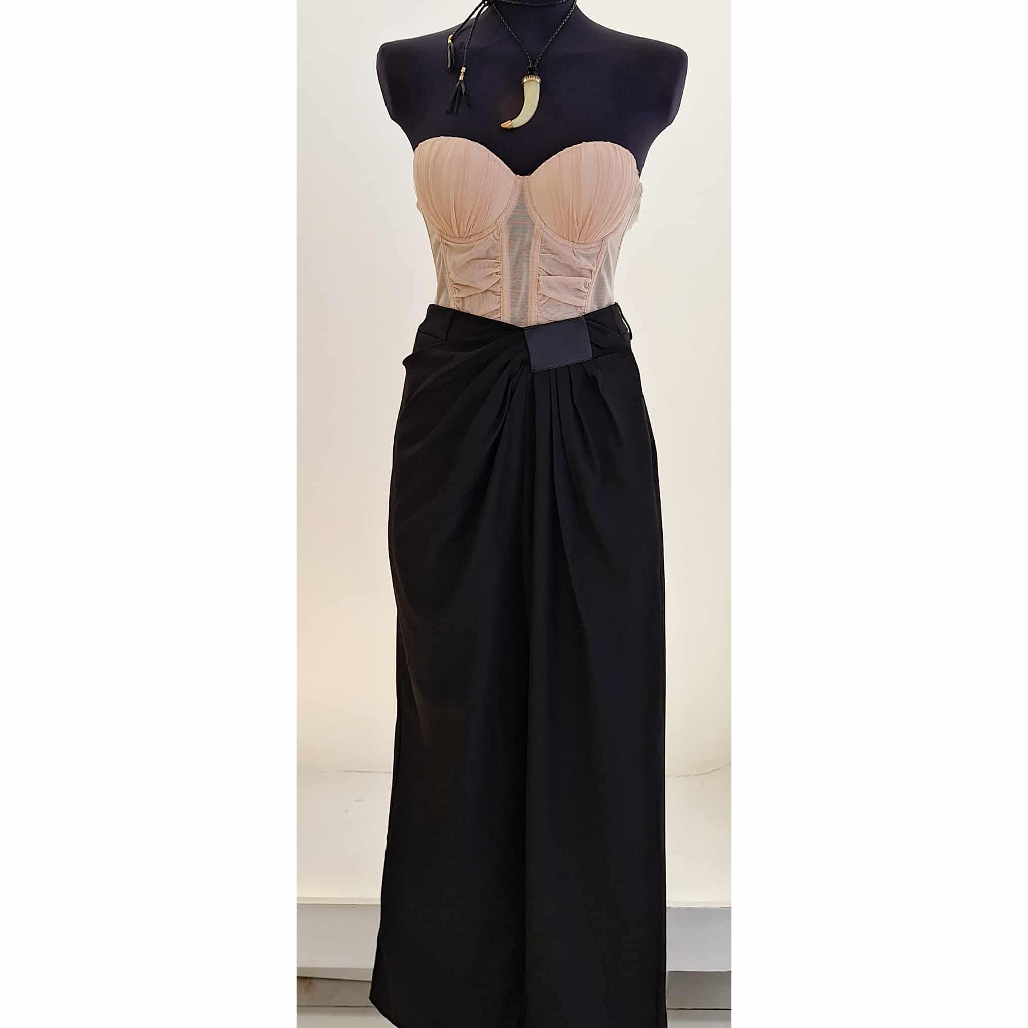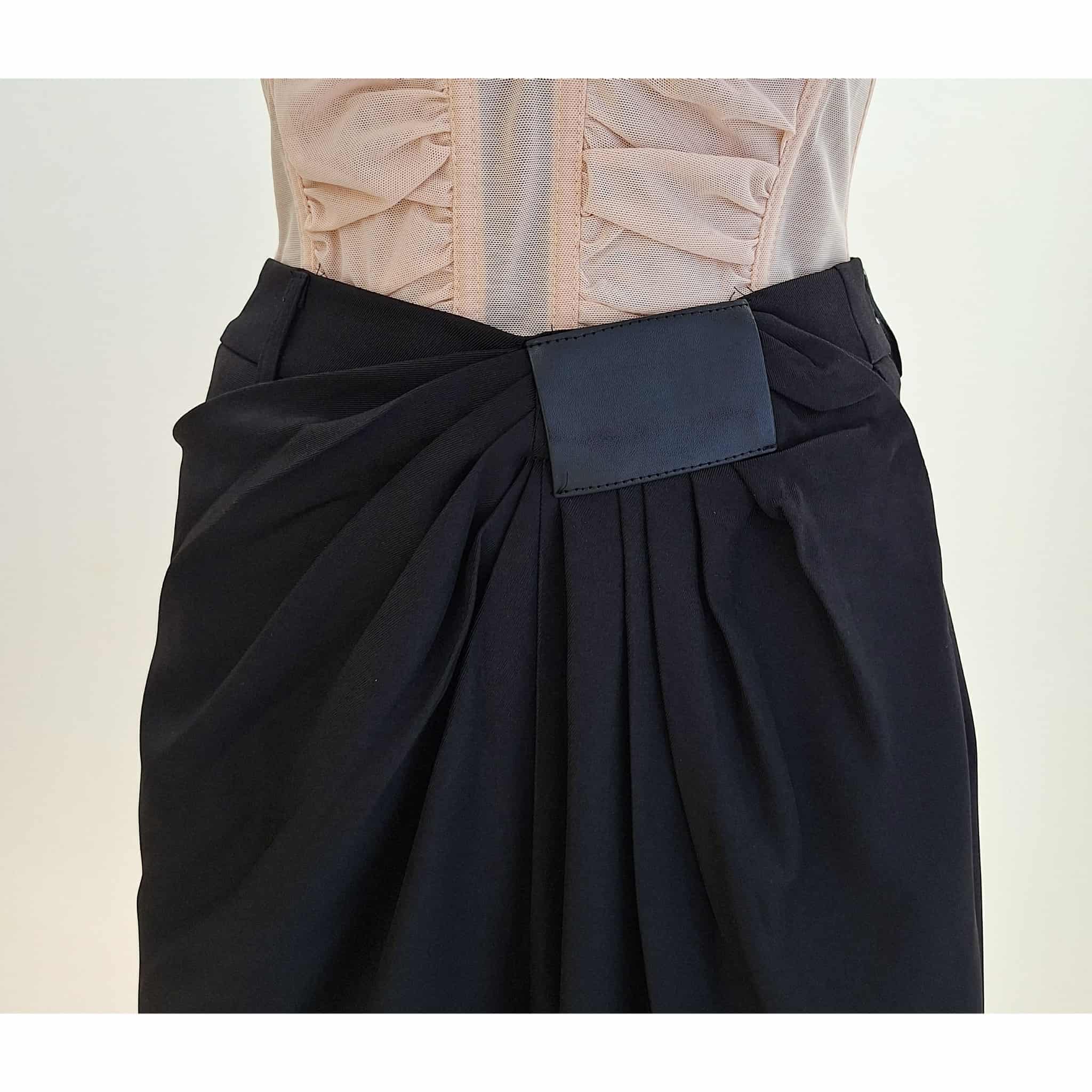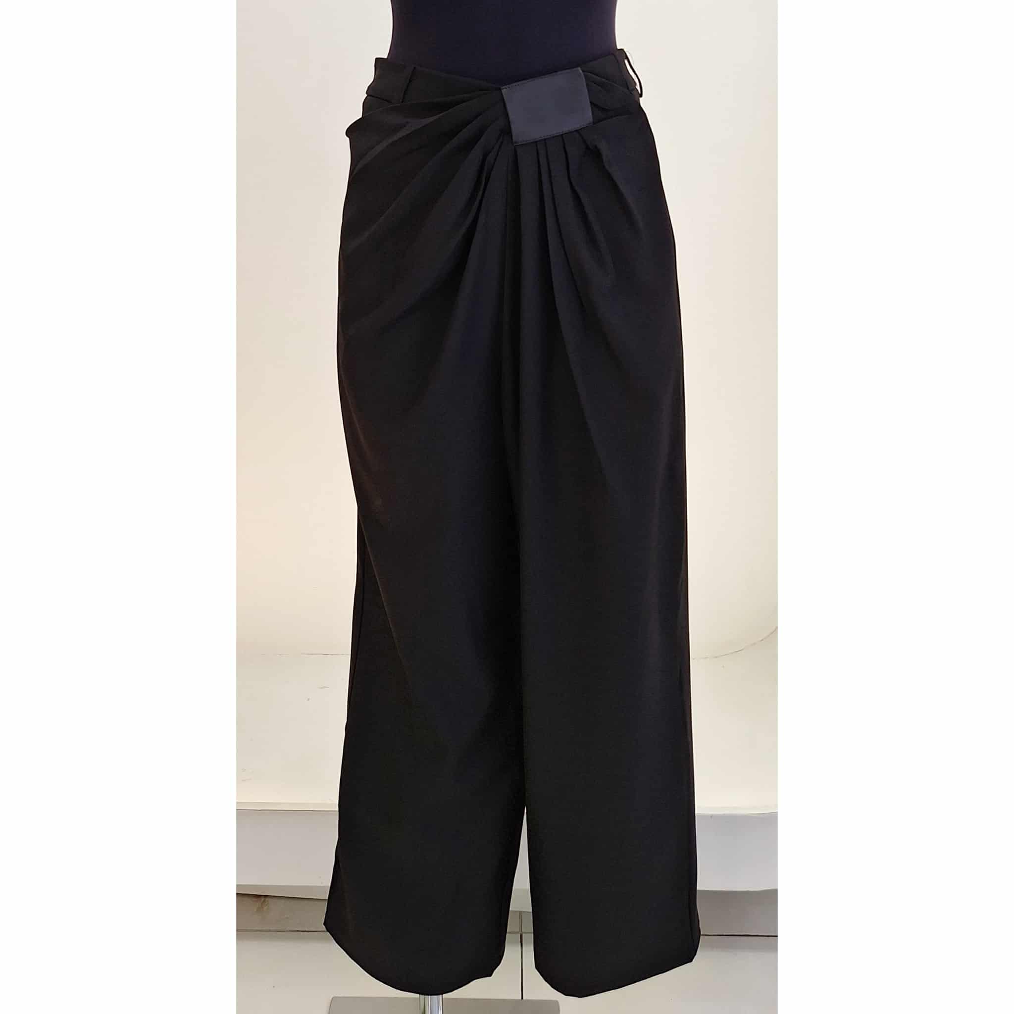 Pantalone nero vita alta con drappeggio asimmetrico, arricciato sul davanti con dettaglio toppa in ecopelle nero