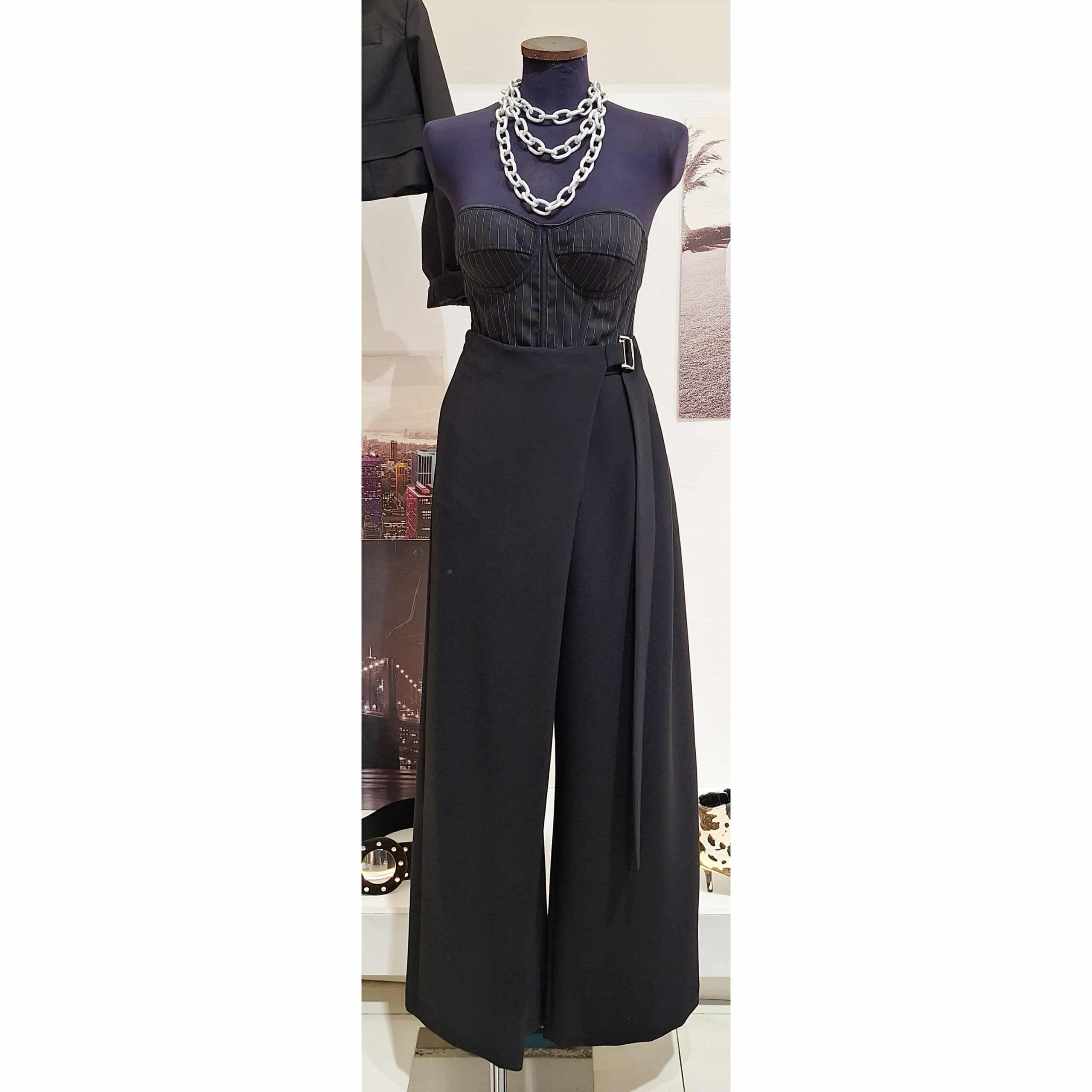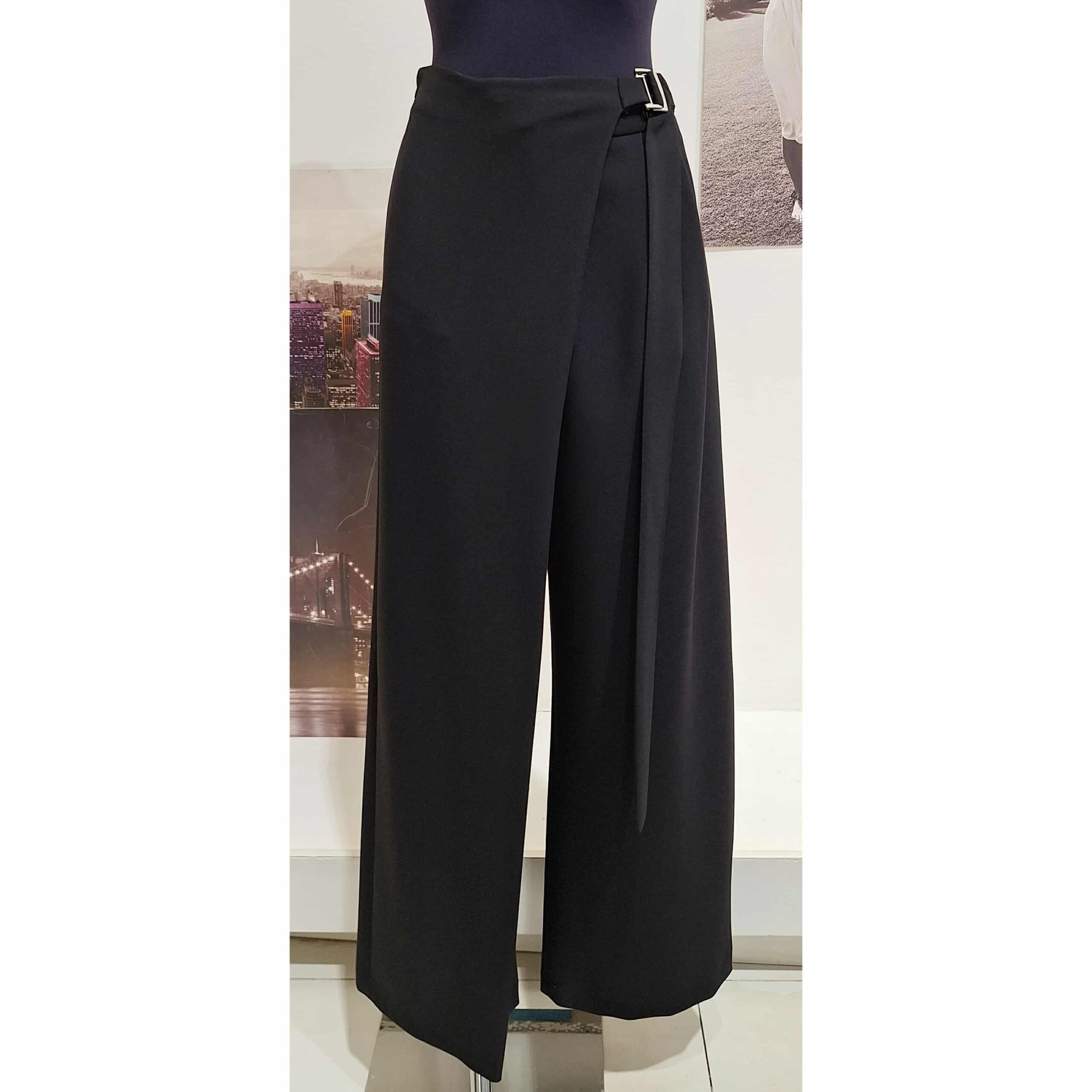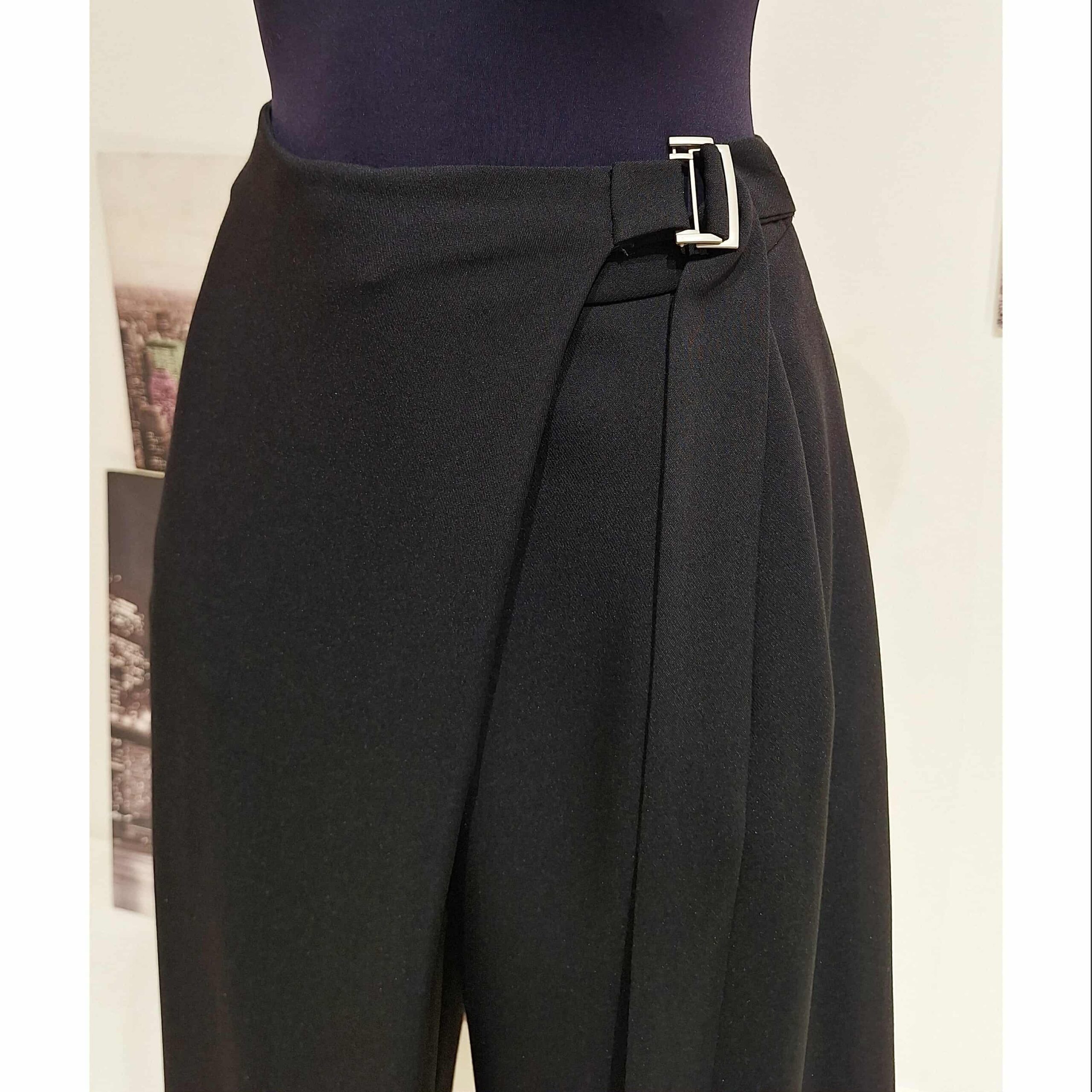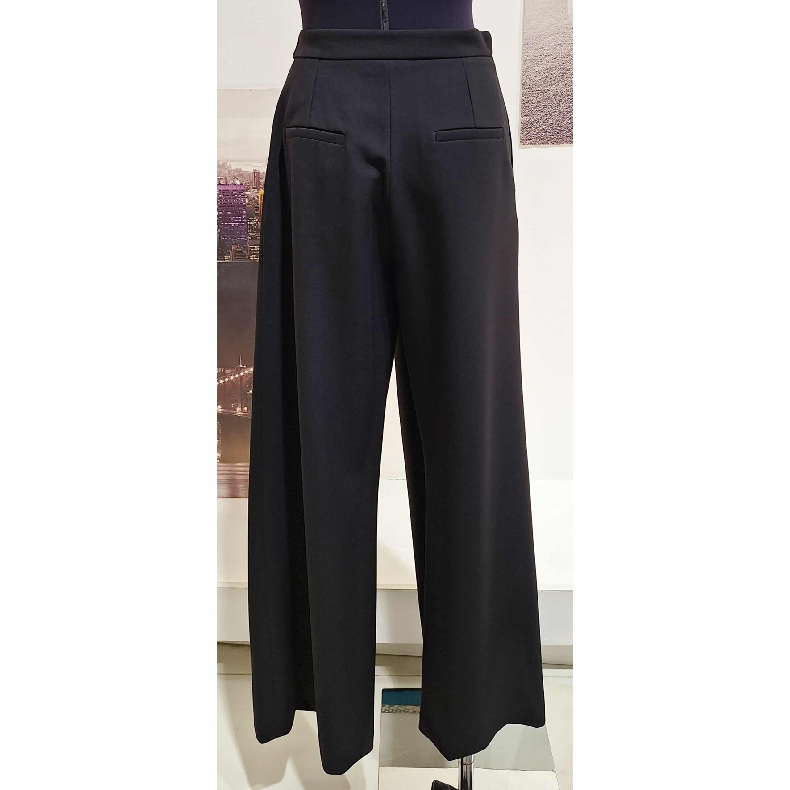 Pantalone nero a portafoglio, vita alta gamba larga con chiusura zip interna e fibia metallica laterale