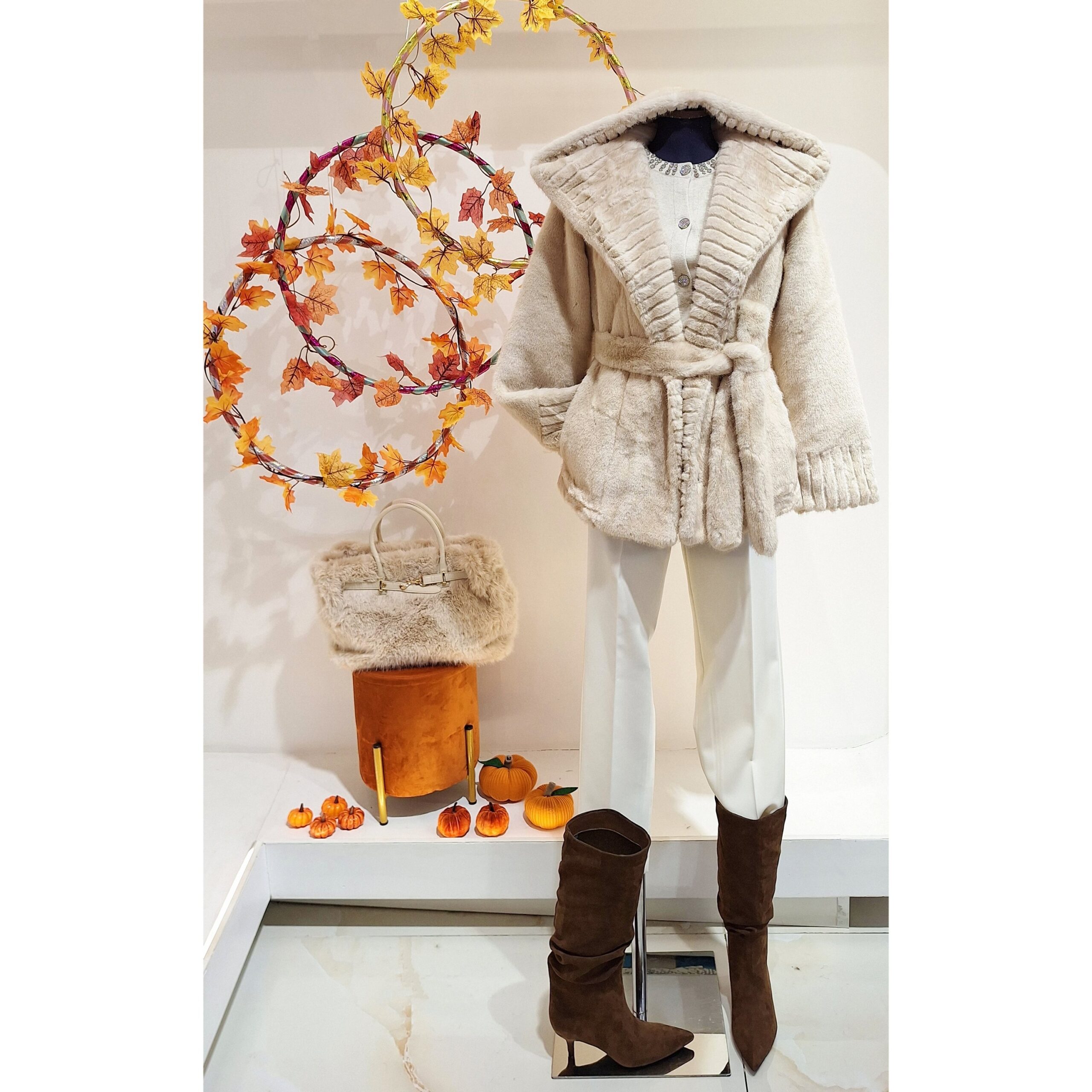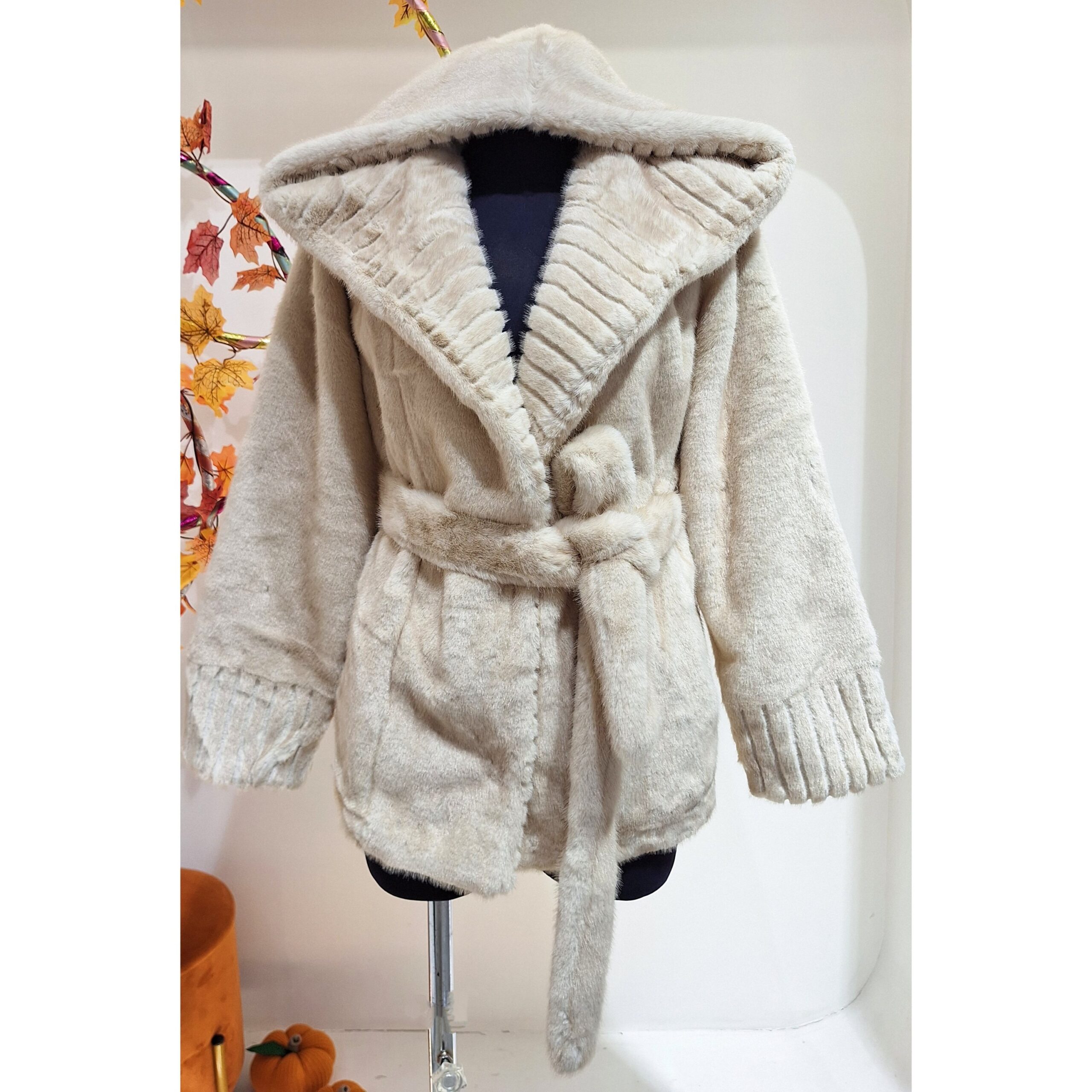 Ecopelliccia panna con cappuccio e cintura, chiusura bottoni a scatto