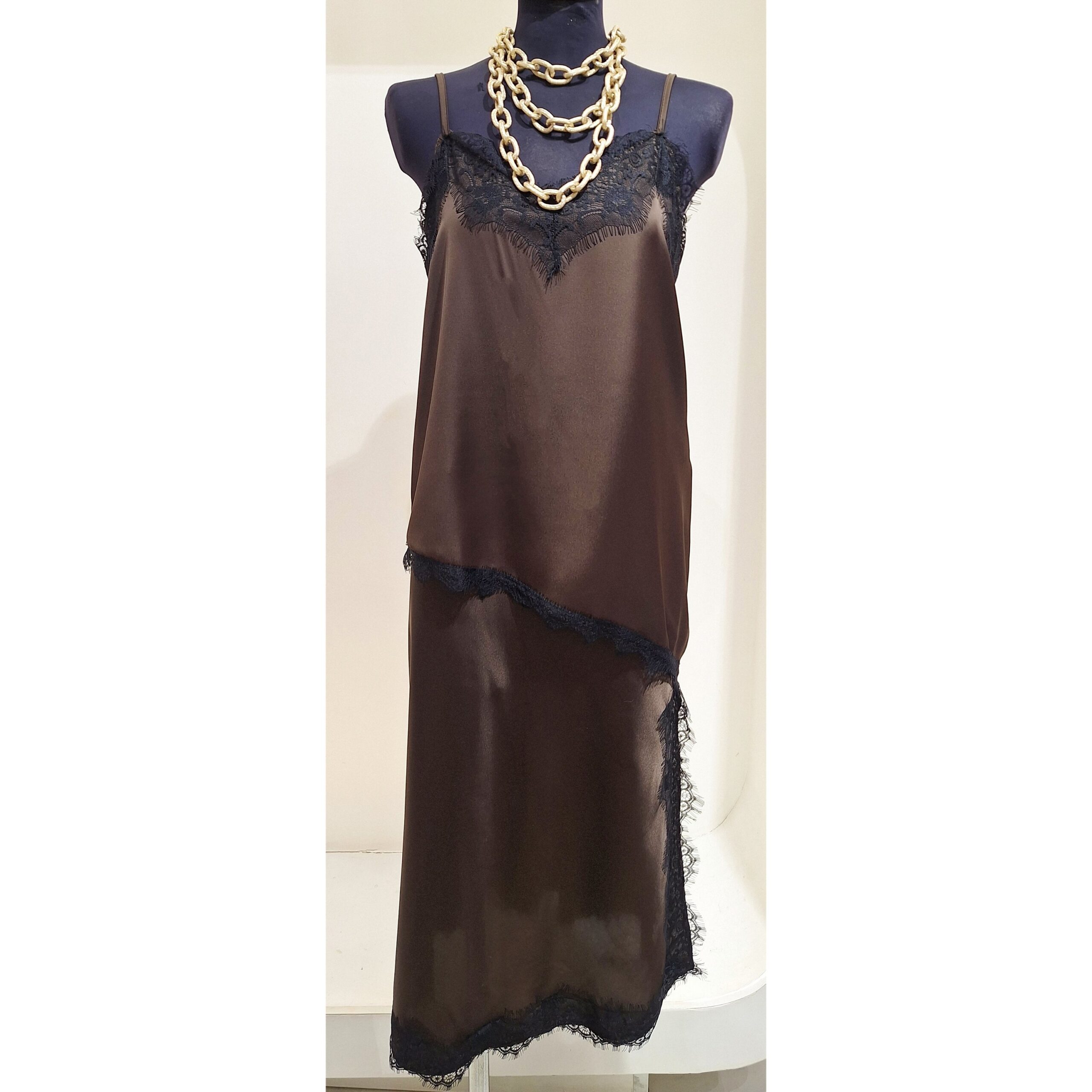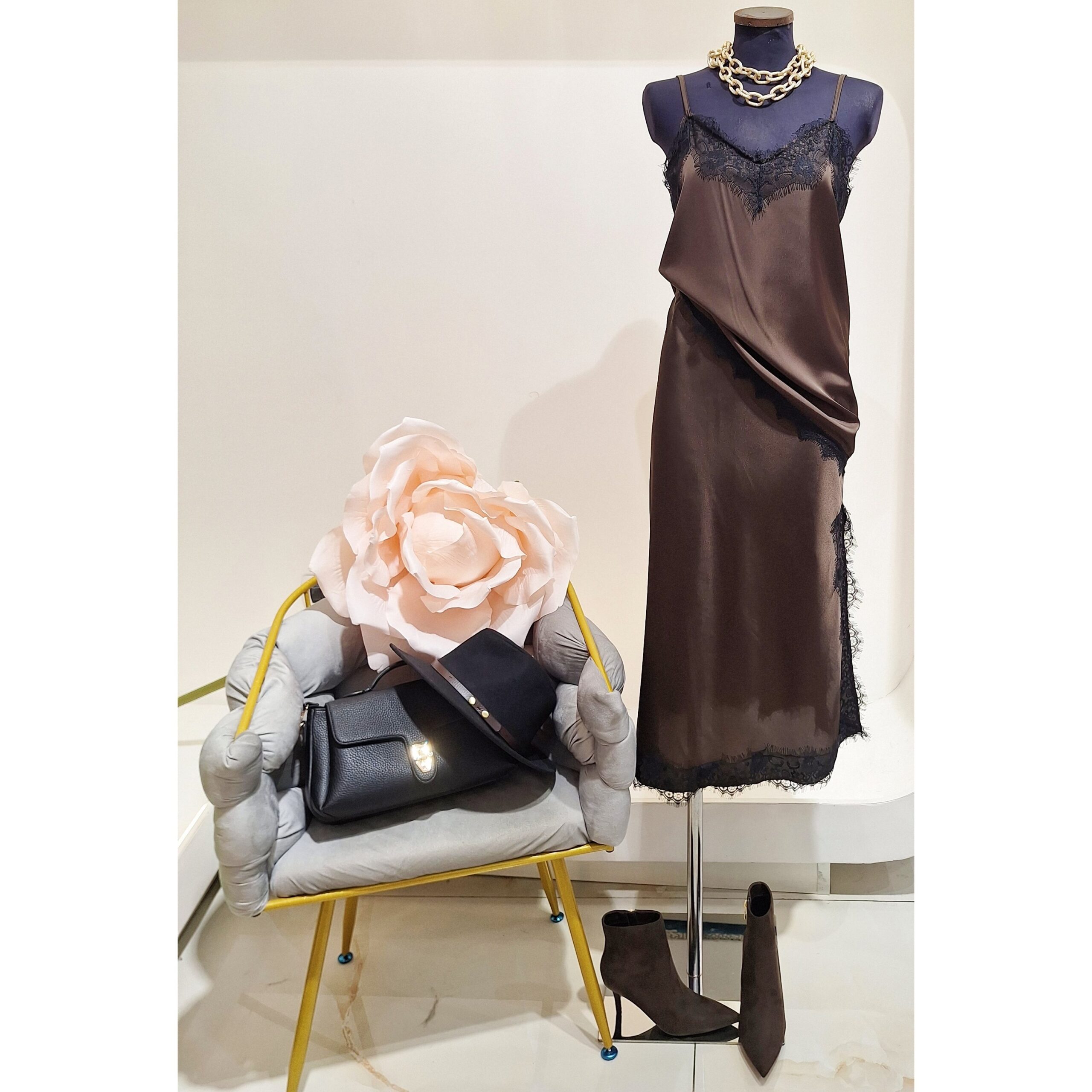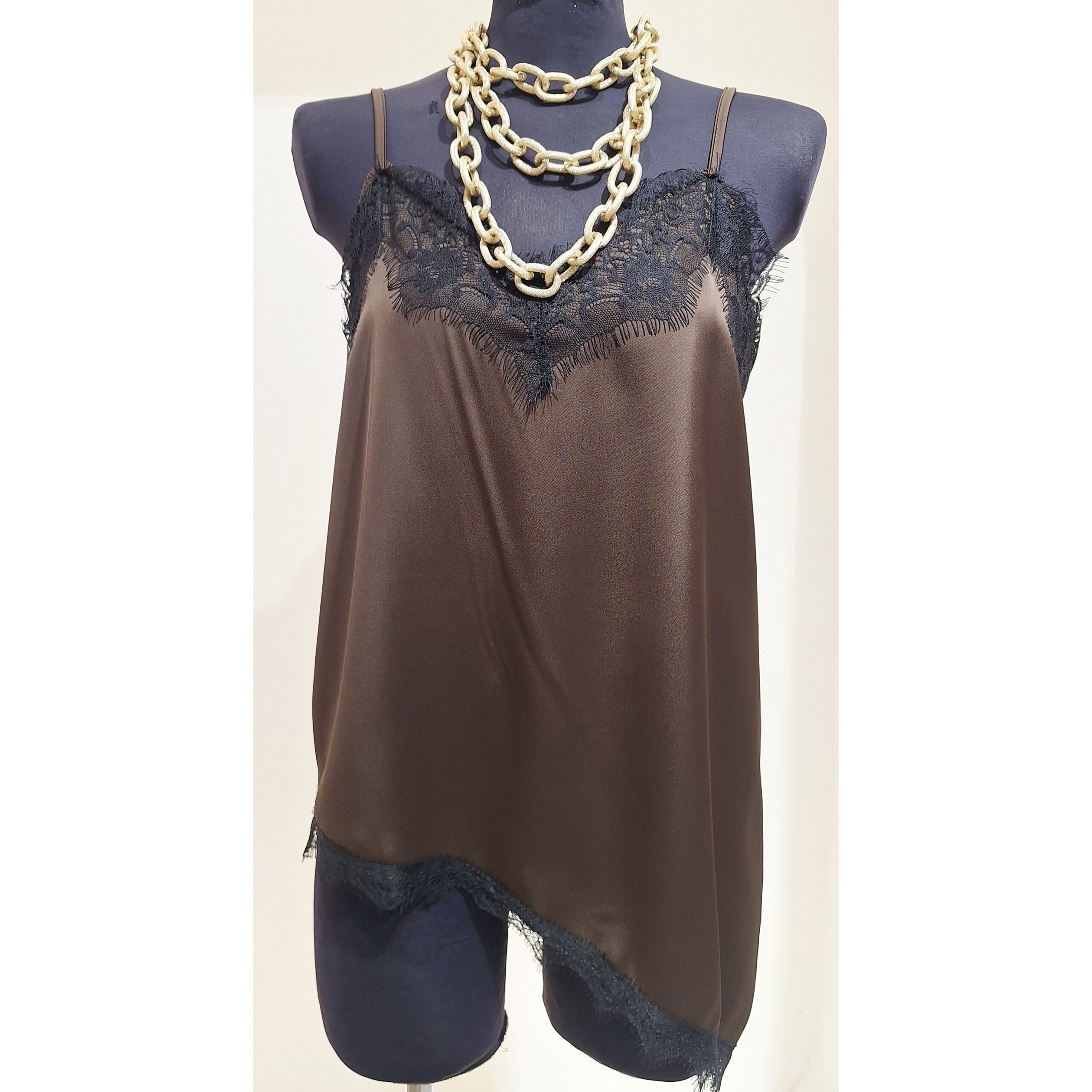 Top in raso marrone con pizzo nero a contrasto, scollo a v e con spalline sottili regolabili